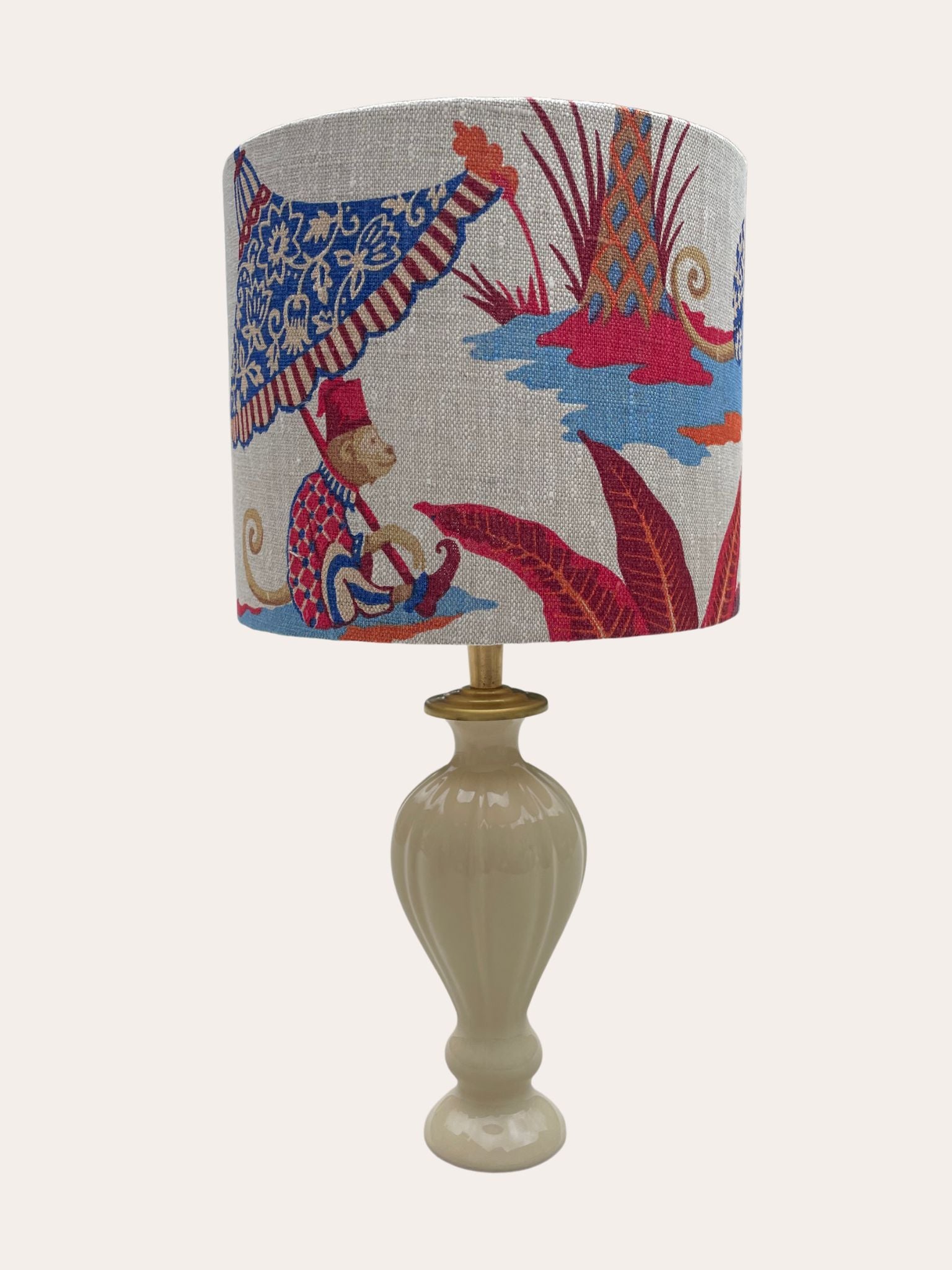 Deze beige voet met klassieke vorm past in ieder interieur. Hier is de lamp gecombineerd met de vrolijke rood blauwe ' Monkey' stof. Je kunt de lamp ook samenstellen met een kap naar keuze. Deze lamp is wireless, wat betekent dat je de lamp overal neer kunt zetten.