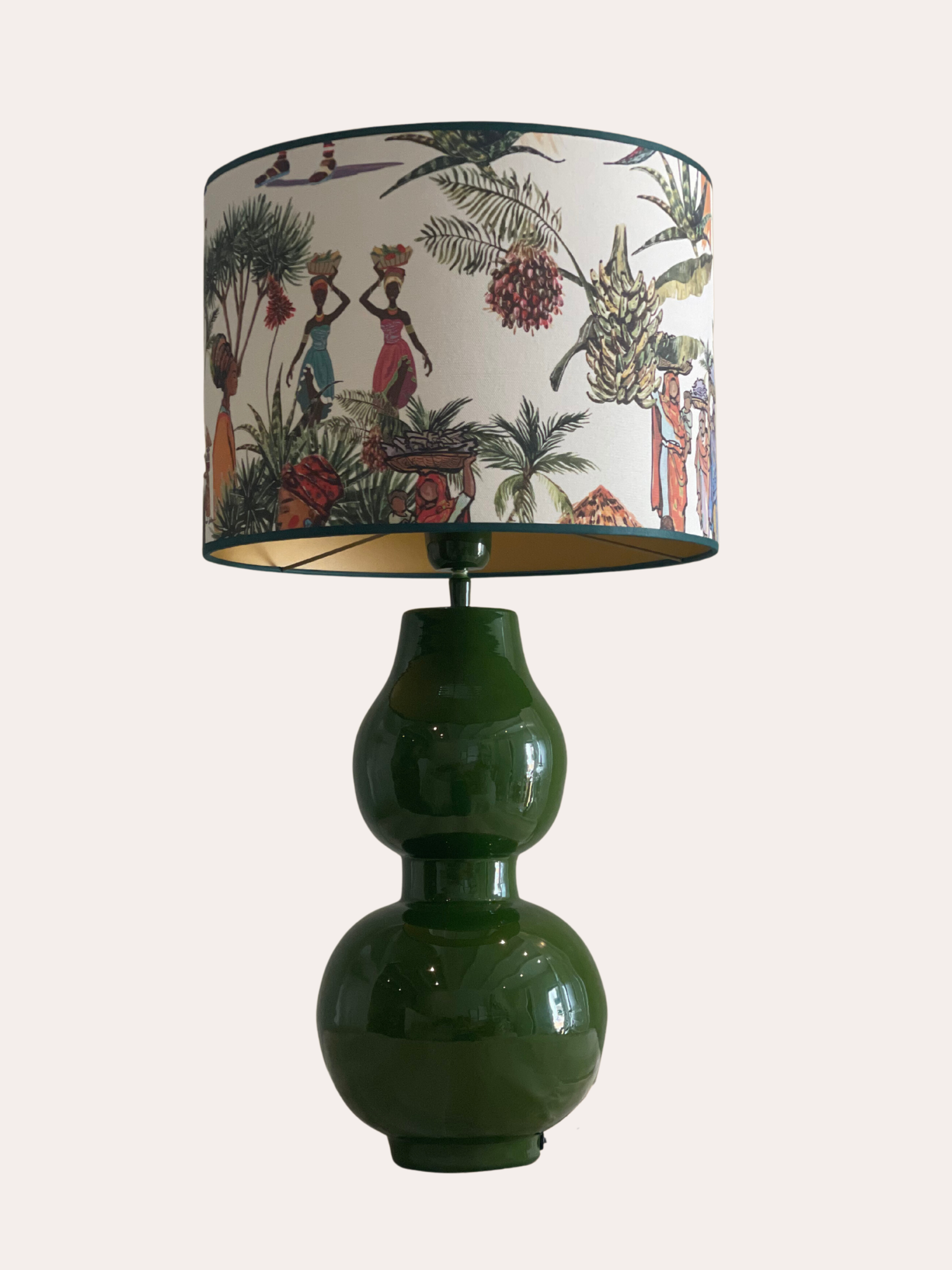 Prachtige lamp, de voet is donker groen en combineert super mooie met deze prachtige stof. De binnenkant is uitgevoerd in mat goud.