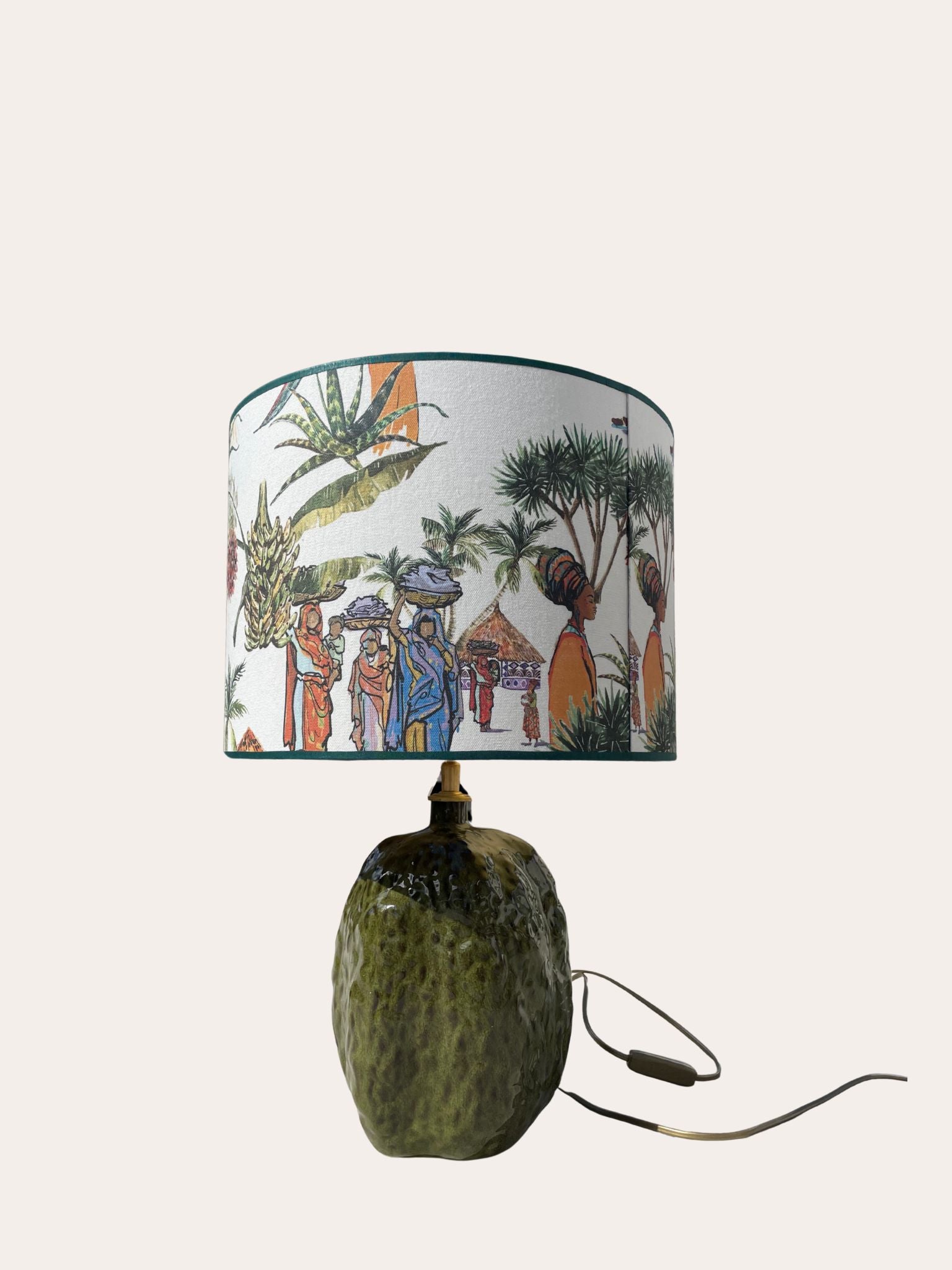Prachtige lamp, de voet is donker groen en combineert super mooie met deze prachtige stof. De binnenkant is uitgevoerd in mat goud.