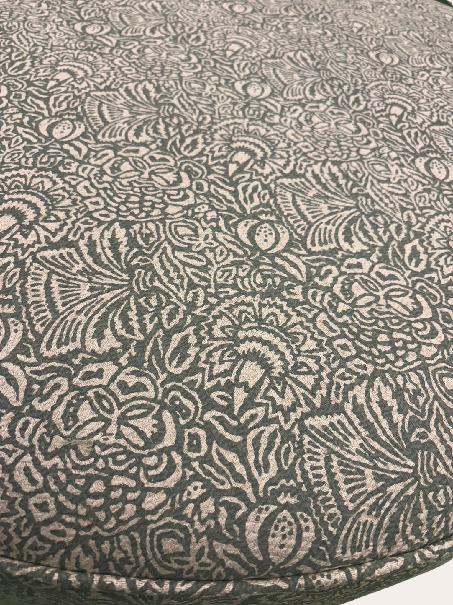 De poef is hier gemaakte met een prachtige stof - Gardyne - van designer James Hare. "Gardyne's intricate pattern draws on the extensive floral and fruit abundance found in Tudor gardens and hot houses. It has all the character of a hand blocked fabric but has been screen printed on to a beautiful herringbone ground".