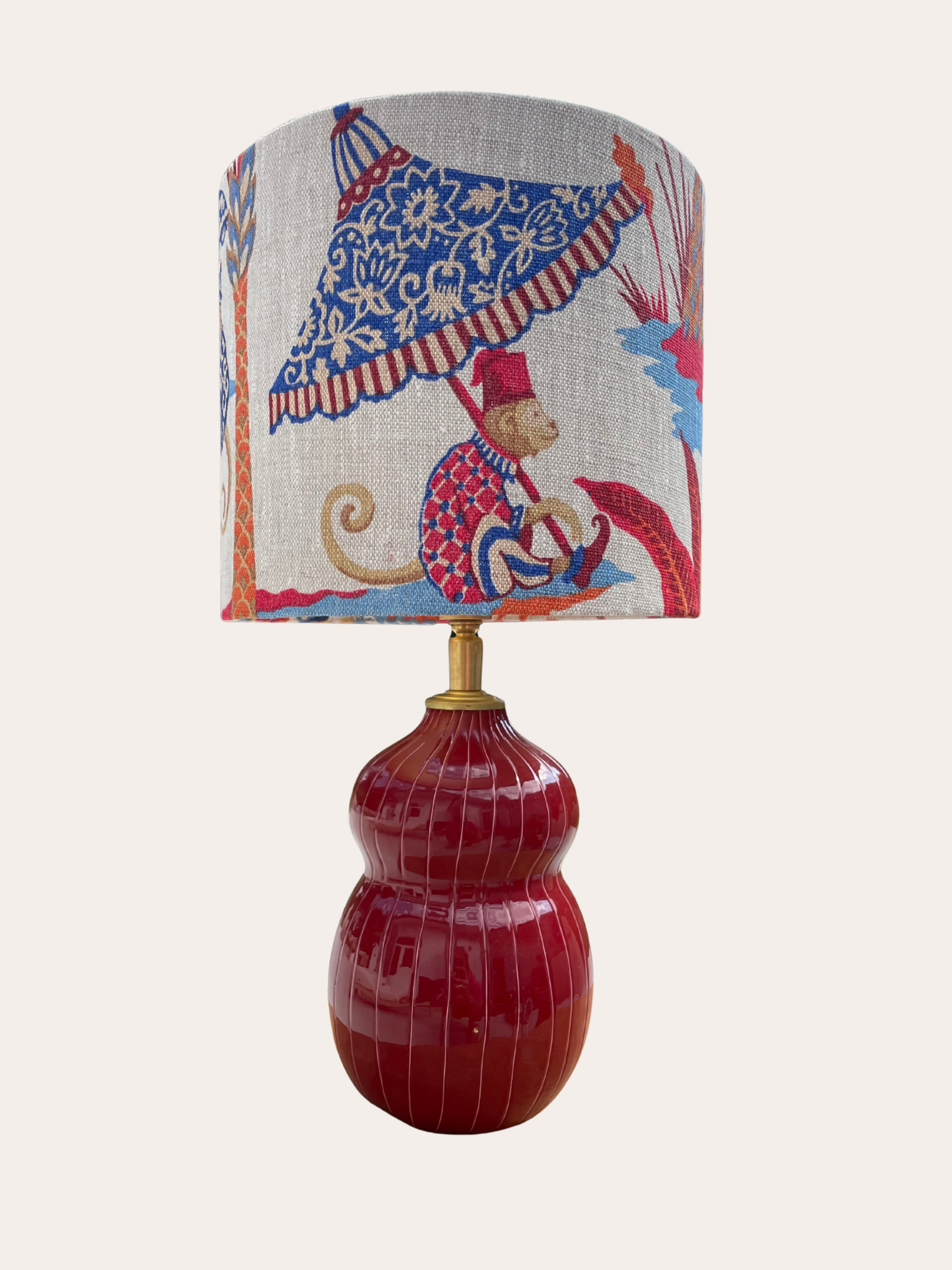 Deze rode lampenvoet past prachtig bij deze gezellige stof met apen print. Een echte eye catcher die je interieur op spiced!