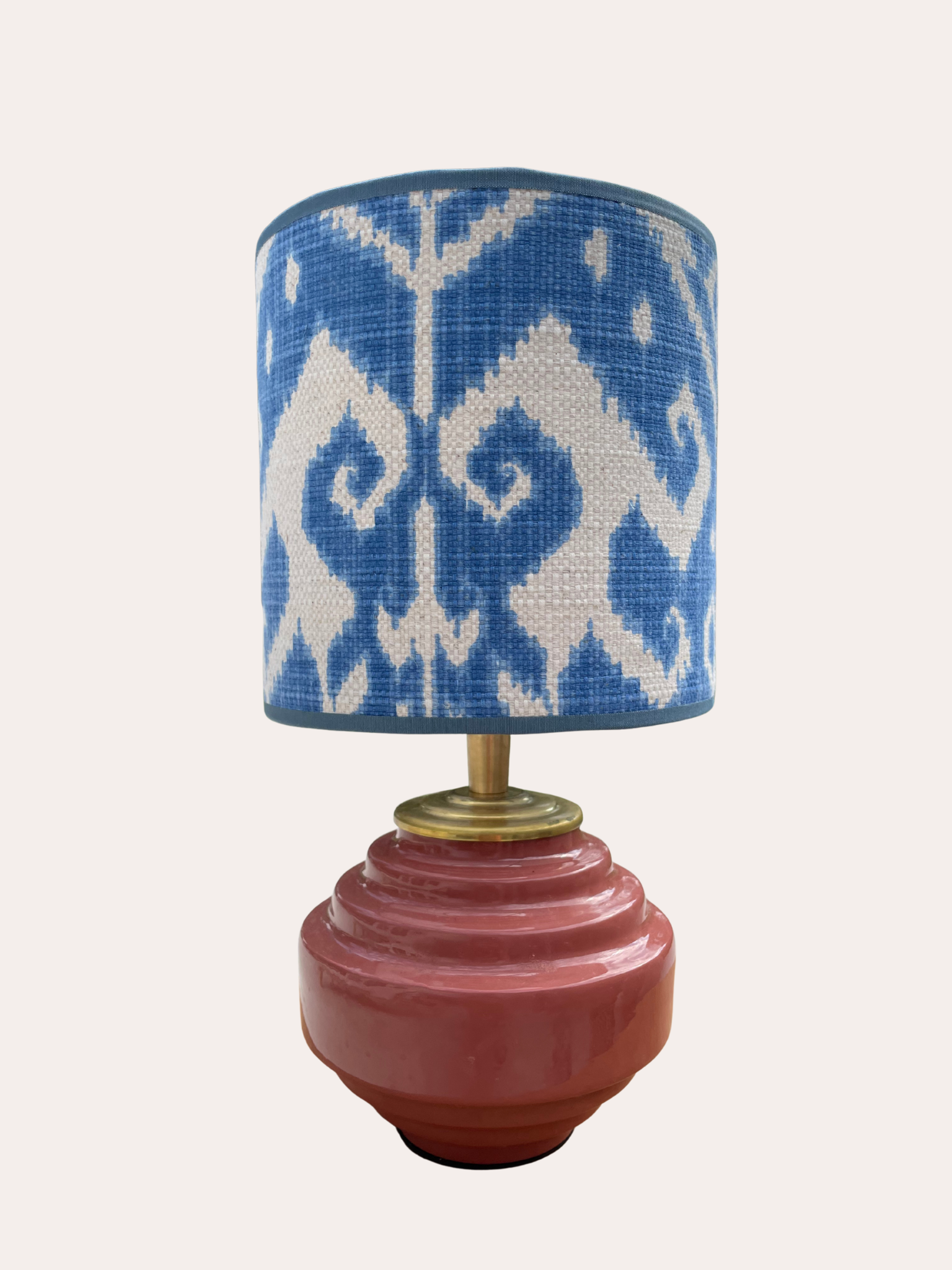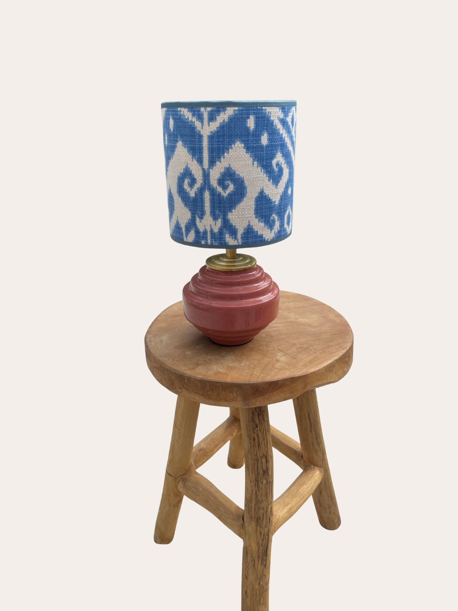 Deze roze/ terra kleurig lampenvoet past prachtig bij deze blauw/ witte ikatee print stof. Een echte eye catcher die je interieur op spiced!